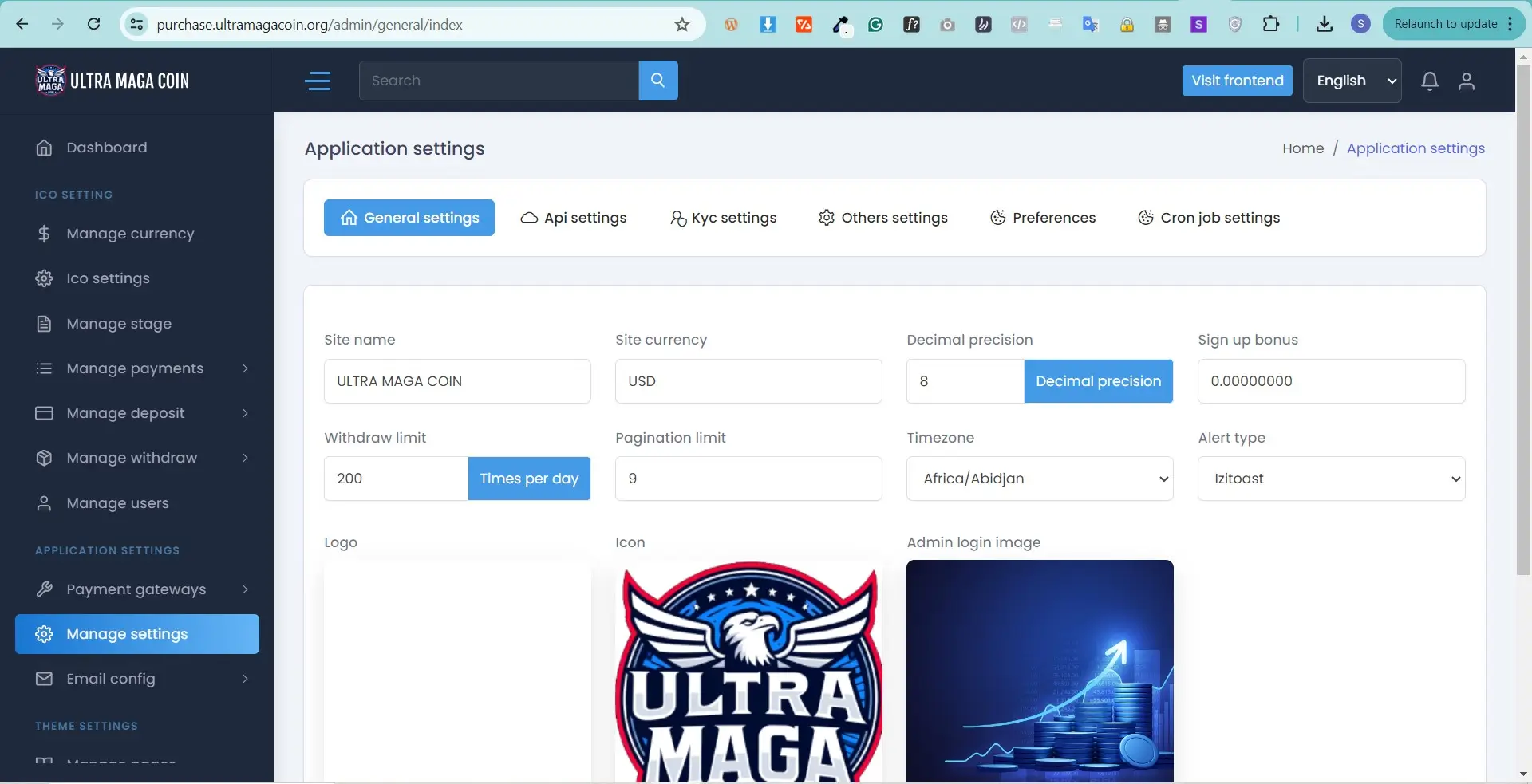 Also KYC settings Cronjobs settings API settings