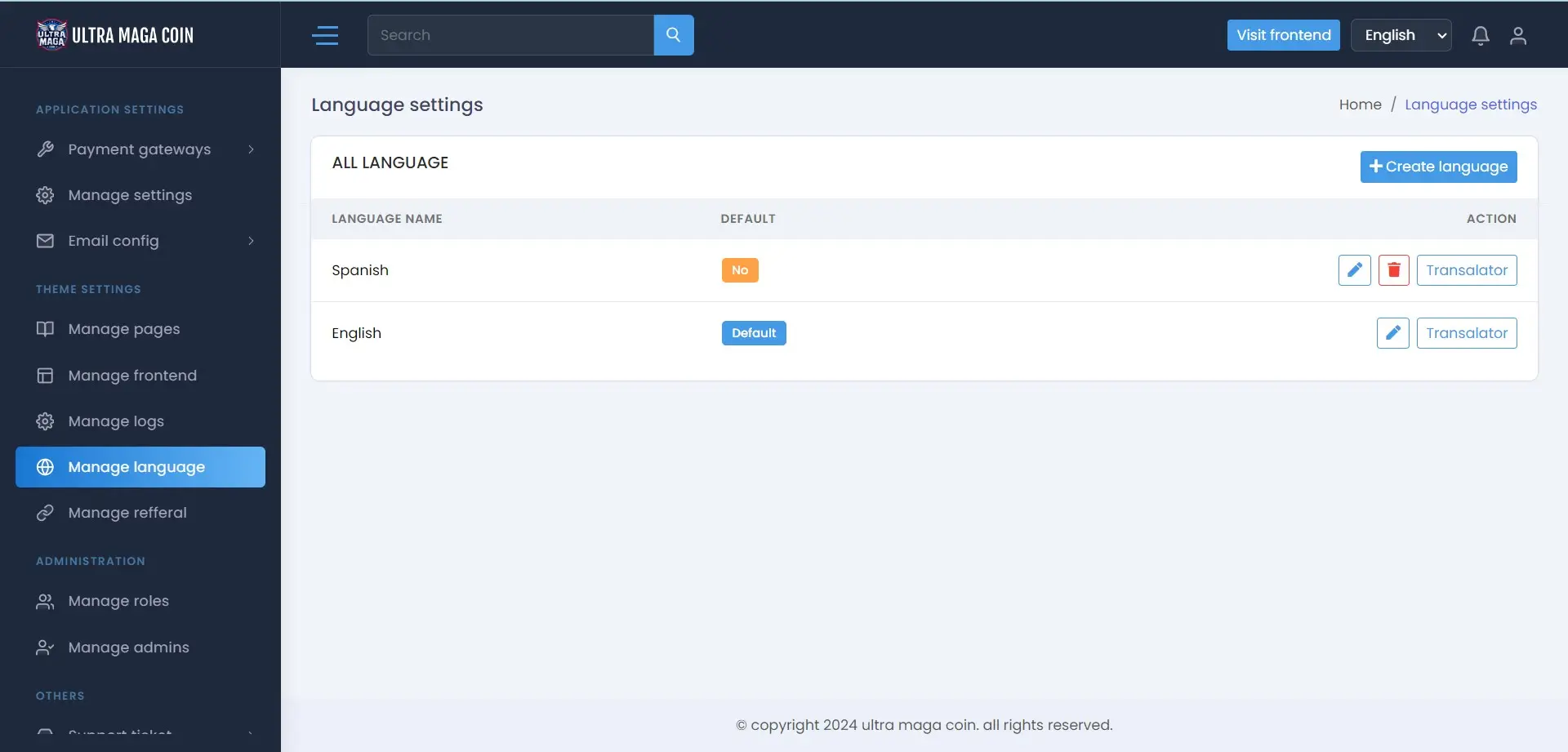 Here you can set your language setting. you can add any kind of language with accurate keyword , You will get general Content and another one Frontend Content . When set new lanaguage , then reload in home page so all home pages content will apear in language key , then you need to translate value according to this key.
