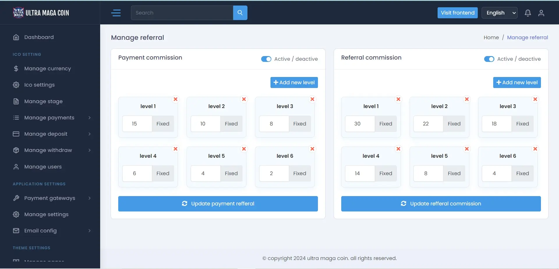Here you can set refferal commission , Payment commission : here referral users when make payment then Level users get commission according to set amount Referral commission : here when a user register with another already registed users refferal link , then level users will gets comission.