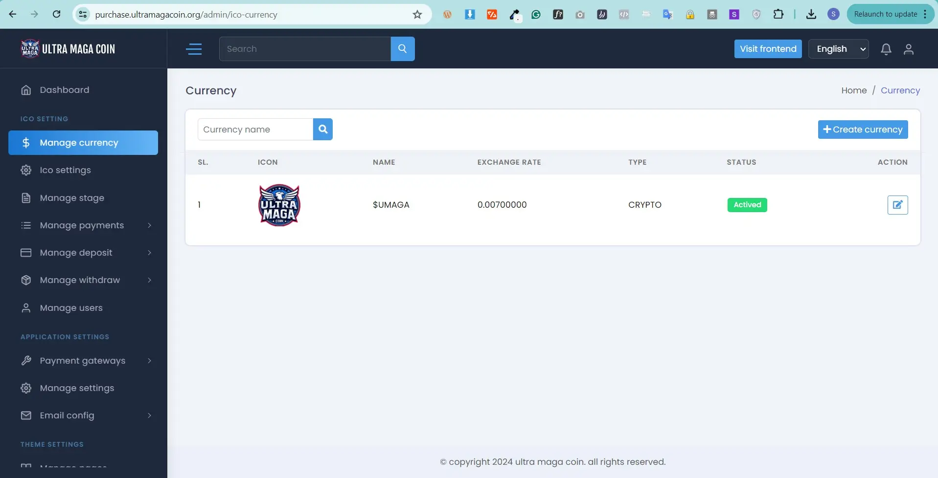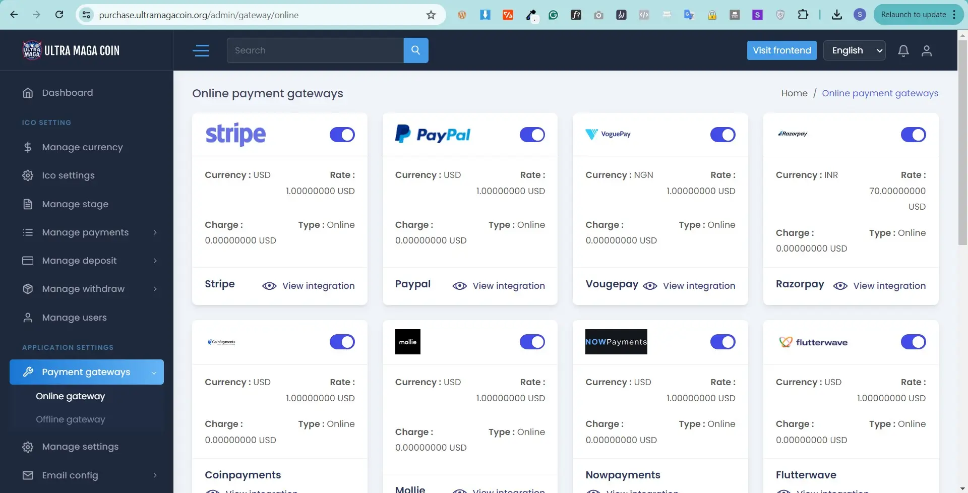 Manage Currency , here you can add multiple currency with their current rate logo , here you will get two types current one is fiat another one crypto . also here you can select desire / sutiable payment gateway according to currency
