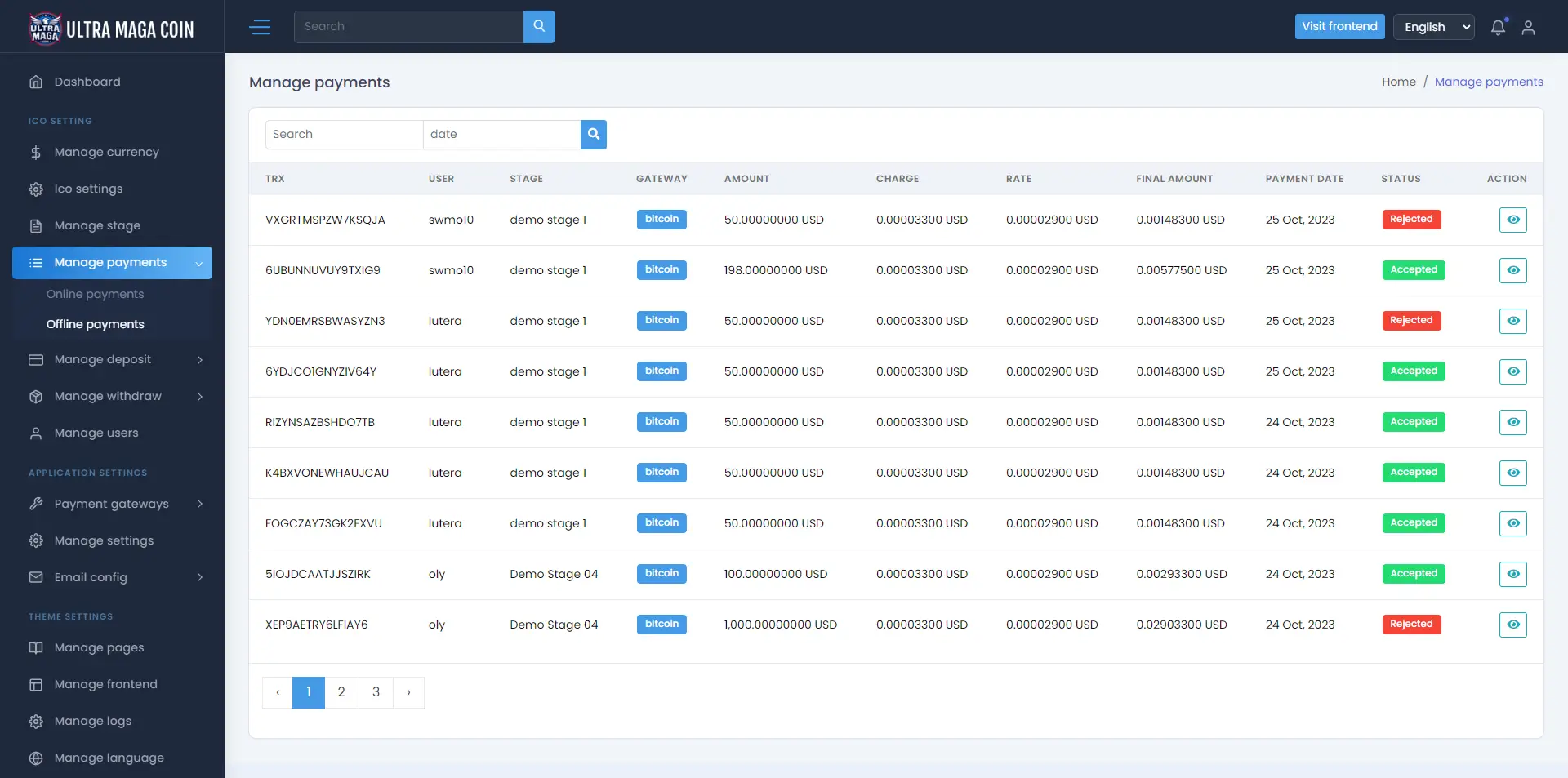 Here you can manage Online and Offline payment using multiple gateway , manual gateway payment you can approve and reject too. Also can see payment amount , charge , date , Trasaction id , stage name